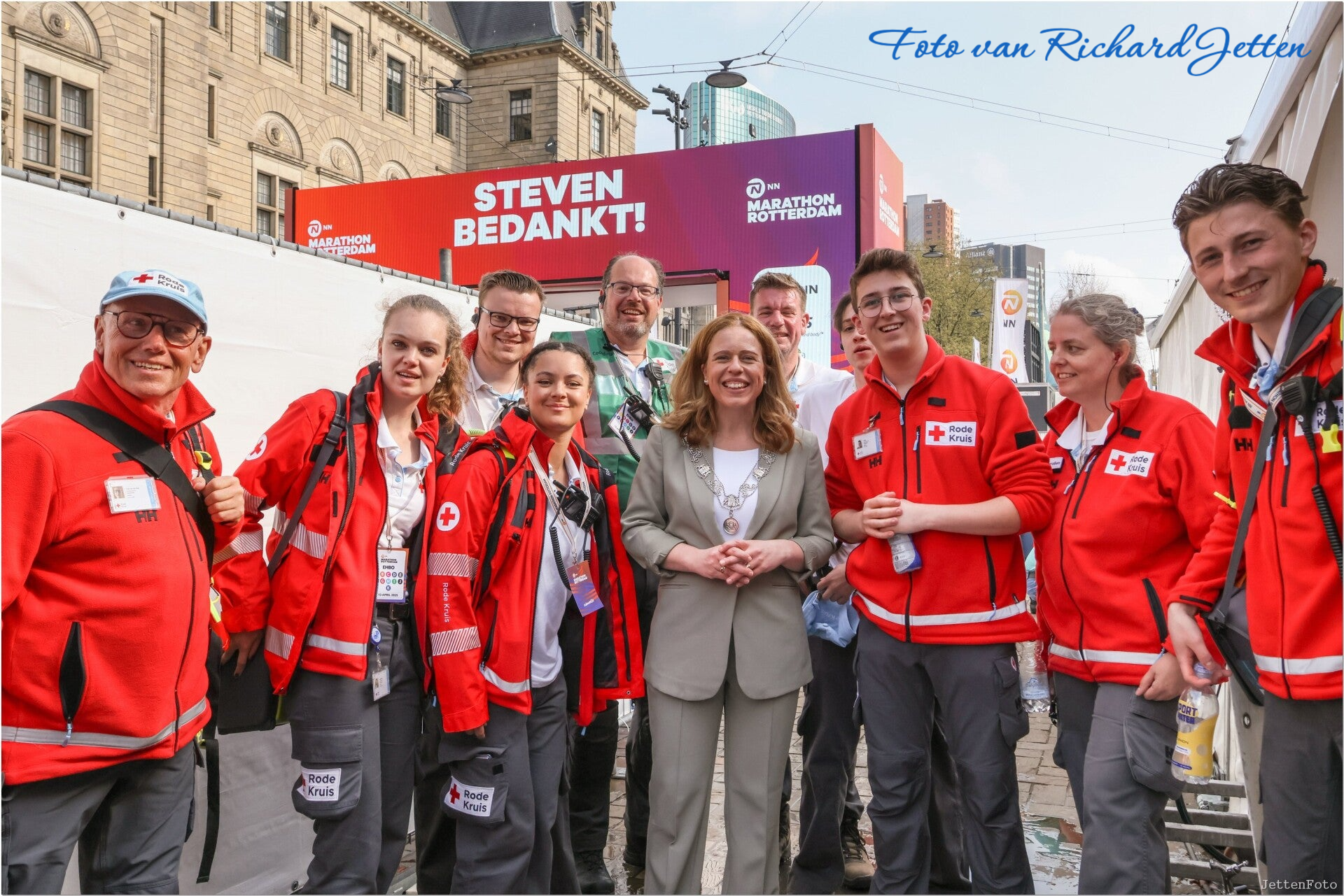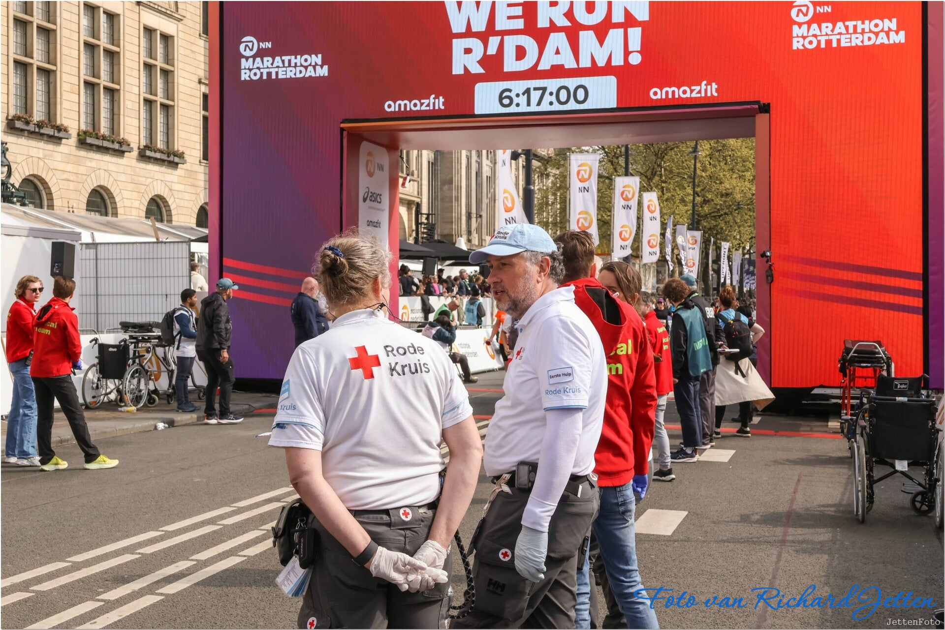 Des te meer voelde het als een eer dat ik tijdens de marathon bij de start/finish mocht staan. Het is belangrijk om je netwerk te kennen, maar ook om af en toe voor jezelf op te komen. Ik heb graag iets om handen. Al is het maar water halen en mensen met hitteletsels begeleiden. Hangen, turen en doelloos heen en weer lopen met EHBO-tas (van 12 kilo), porto en AED is minder mijn ding. Ik geef liever training in het veld. Liever geen porto, dan heb ik tenminste mijn handen vrij en kan ik EHBO-er zijn i.p.v. verbindelaar.
